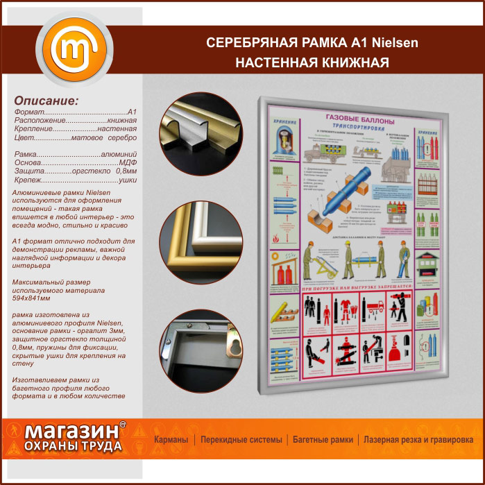 Багетная настенная рамка «Nielsen» А1 формата, книжная, матовое серебро в Магнитогорске купить