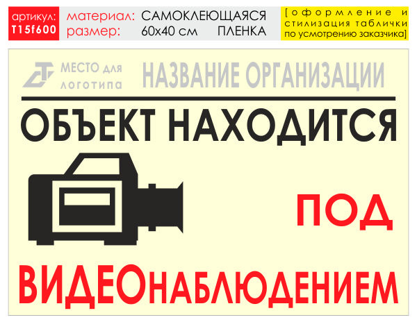 Баннер «Видеонаблюдение» (T15) может быть изготовен в различных размерах на самоклеящейся плёнке, ПВХ-пластике или баннерной ткани (а также на металле - под заказ) как по нашему, так и по Вашему макету или эскизу. В цену баннера включены: разработка и согласование макета, а также изготовление и упаковка. Изготавливаем таблички любых размеров и на любом материале (включая и металл) по Вашим макетам и эскизам