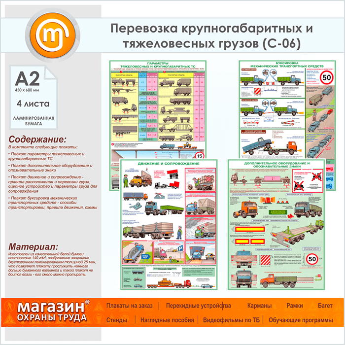 Плакаты «Перевозка крупногабаритных и тяжеловесных грузов» (С-06, ламинированная бумага, А2, 4 листа) в Магнитогорске купить