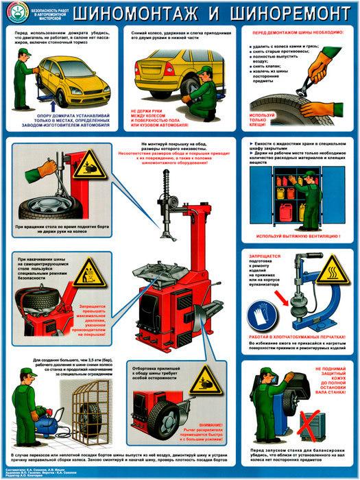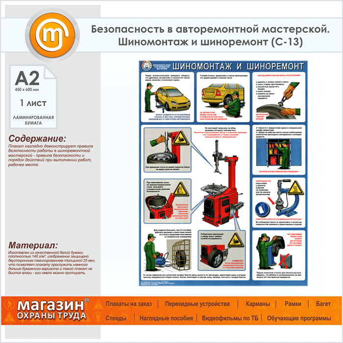 Плакат «Безопасность в авторемонтной мастерской. Шиномонтаж и шиноремонт» (С-13, ламинированная бумага, А2, 1 лист) в Магнитогорске купить