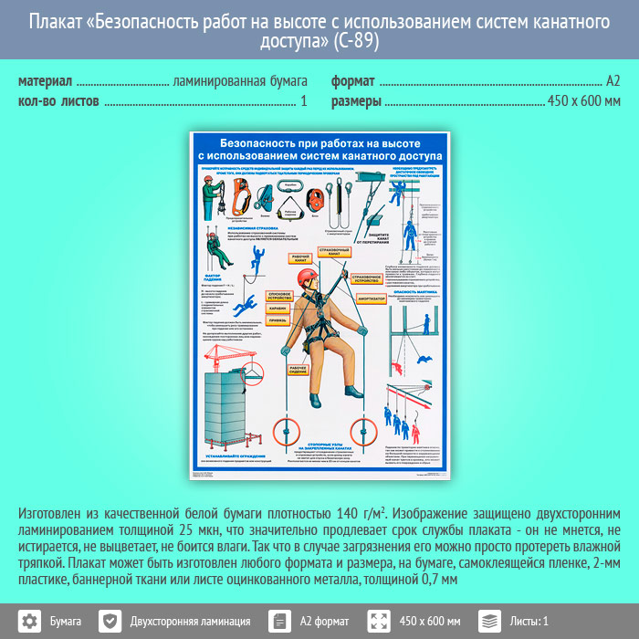 Плакат «Безопасность работ на высоте с использованием систем канатного доступа» (С-89, ламинированная бумага, А2, 1 лист) в Магнитогорске купить