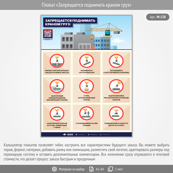 Плакат «Запрещается поднимать краном груз» с QR (М-138, 1 лист) в Магнитогорске купить