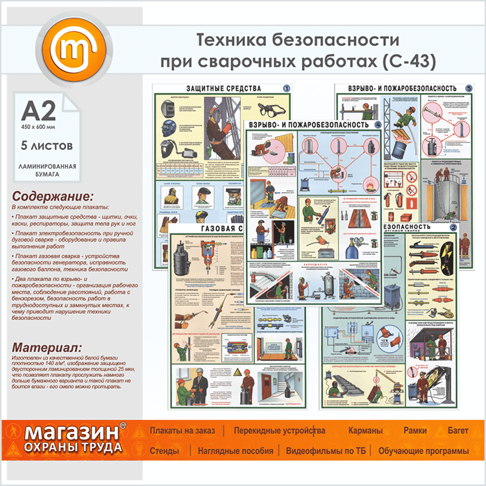 Плакаты «Техника безопасности при сварочных работах» (С-43, ламинированная бумага, А2, 5 листов) в Магнитогорске купить