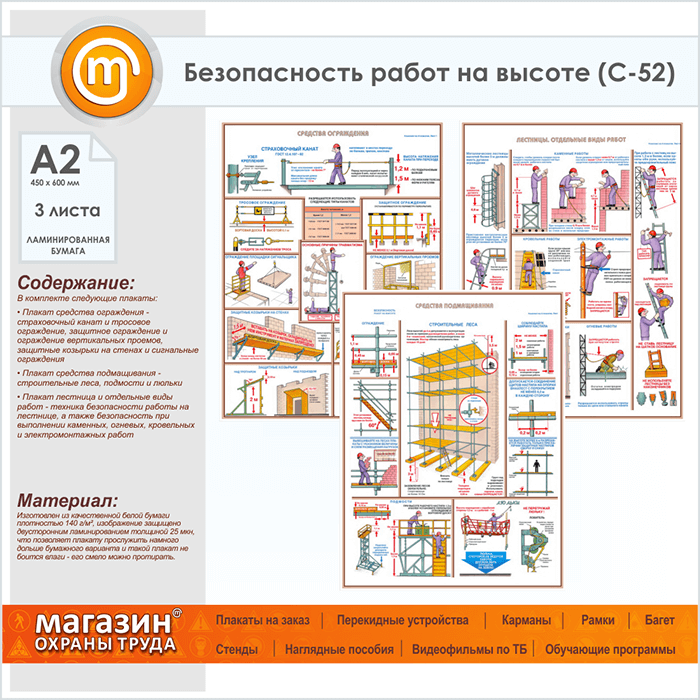 Плакаты «Безопасность работ на высоте» (С-52, ламинированная бумага, А2, 3 листа) в Магнитогорске купить