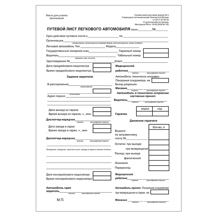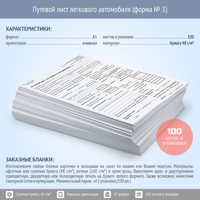 Путевой лист легкового автомобиля (форма № 3, упаковка из 100 штук) в Магнитогорске купить