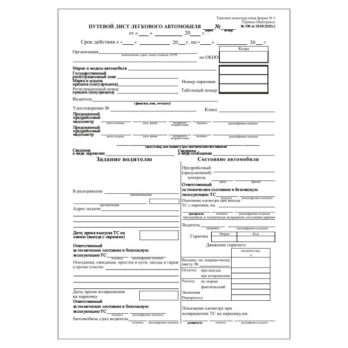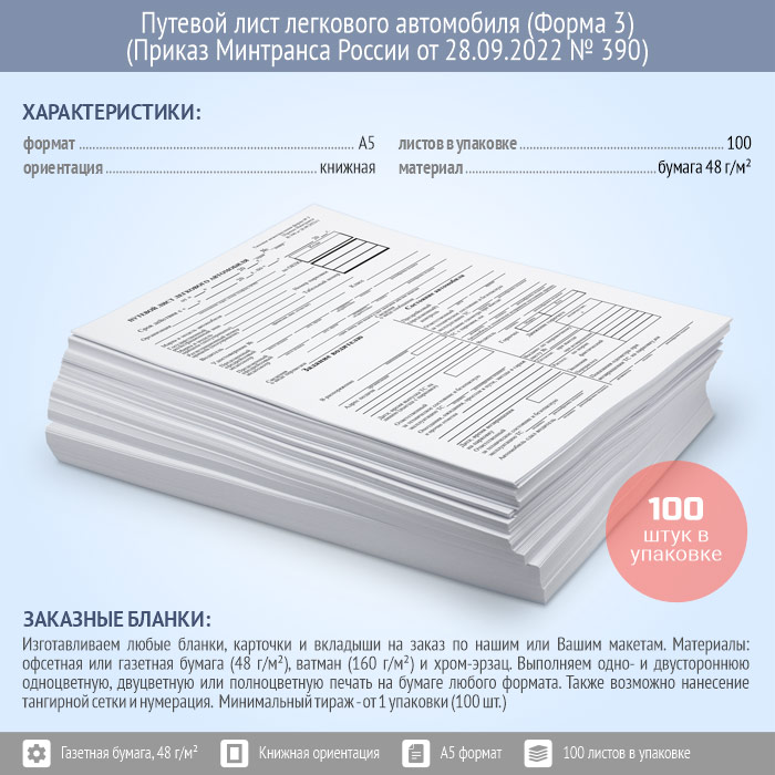 Путевой лист легкового автомобиля (Форма № 3) (Приказ Минтранса России от 28.09.2022 № 390) (упаковка из 100 штук) в Магнитогорске купить
