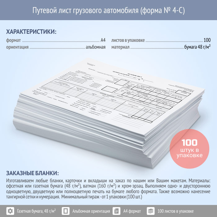 Путевой лист грузового автомобиля (форма № 4-С, упаковка из 100 штук) в Магнитогорске купить