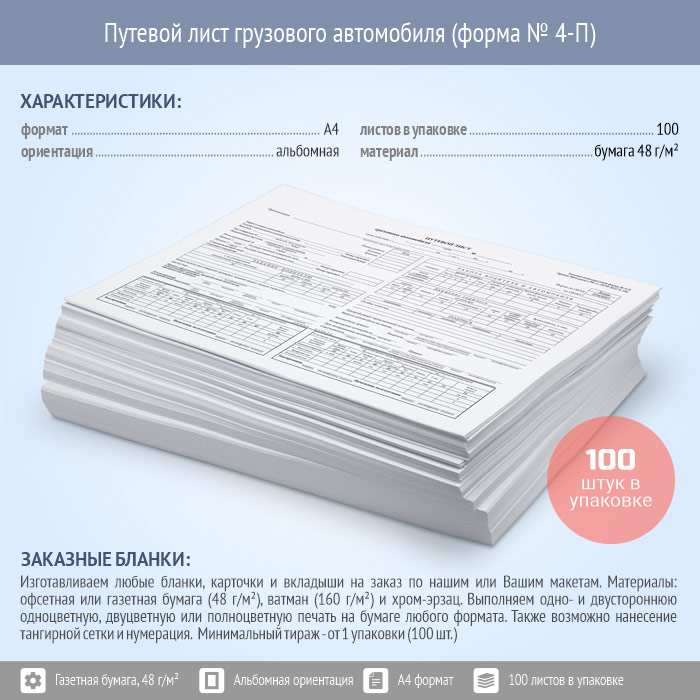 Путевой лист грузового автомобиля (форма № 4-П, упаковка из 100 штук) в Магнитогорске купить