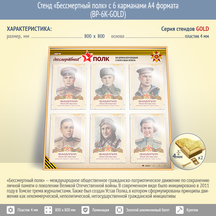 Стенд «Бессмертный полк» с 6 карманами А4 формата (BP-6K-GOLD) в Магнитогорске купить