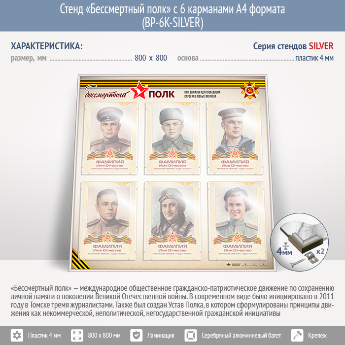 Стенд «Бессмертный полк» с 6 карманами А4 формата (BP-6K-SILVER) в Магнитогорске купить