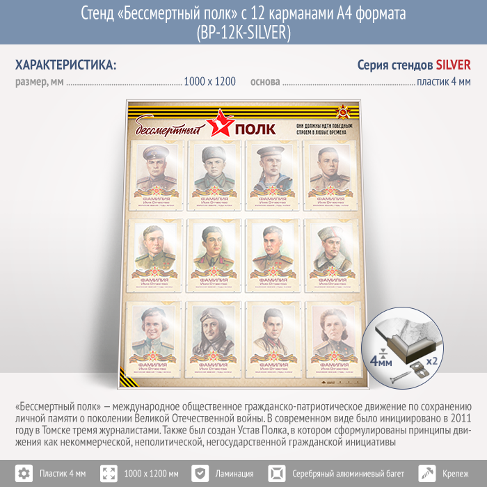 Стенд «Бессмертный полк» с 12 карманами А4 формата (BP-12K-SILVER) в Магнитогорске купить