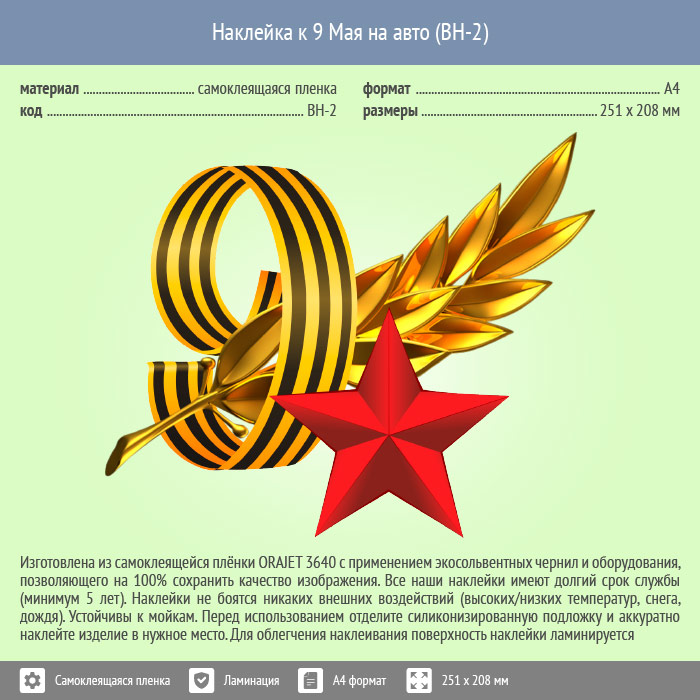 Наклейка к 9 Мая на авто А4 формата (BH-2) в Магнитогорске купить