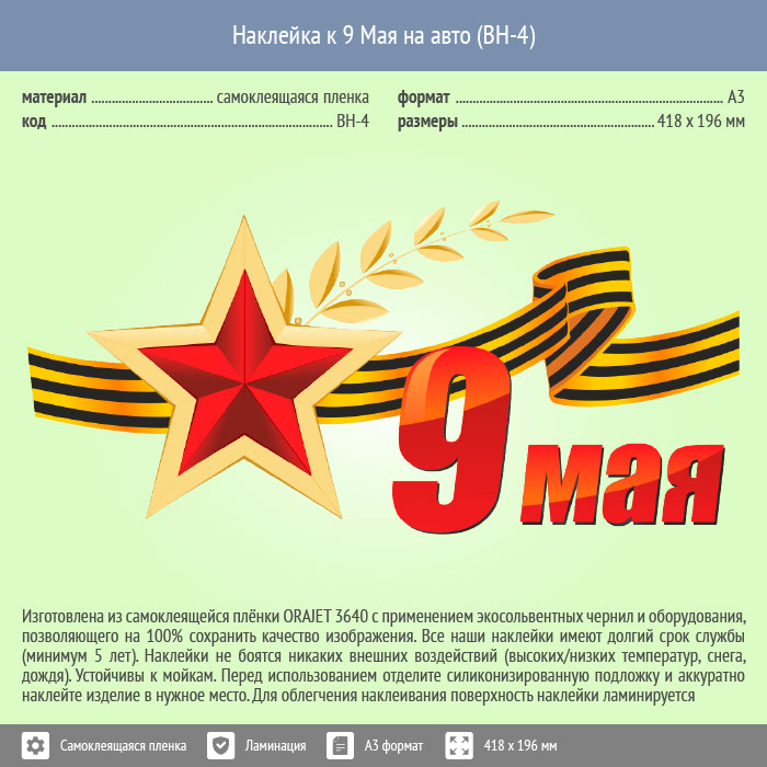 Наклейка к 9 Мая на авто А3 формата (BH-4) в Магнитогорске купить
