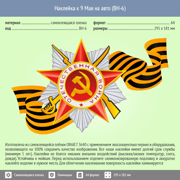 Наклейка к 9 Мая на авто А4 формата (BH-6) в Магнитогорске купить