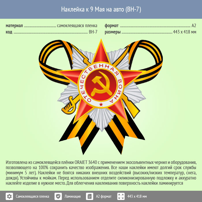 Наклейка к 9 Мая на авто А2 формата (BH-7) в Магнитогорске купить