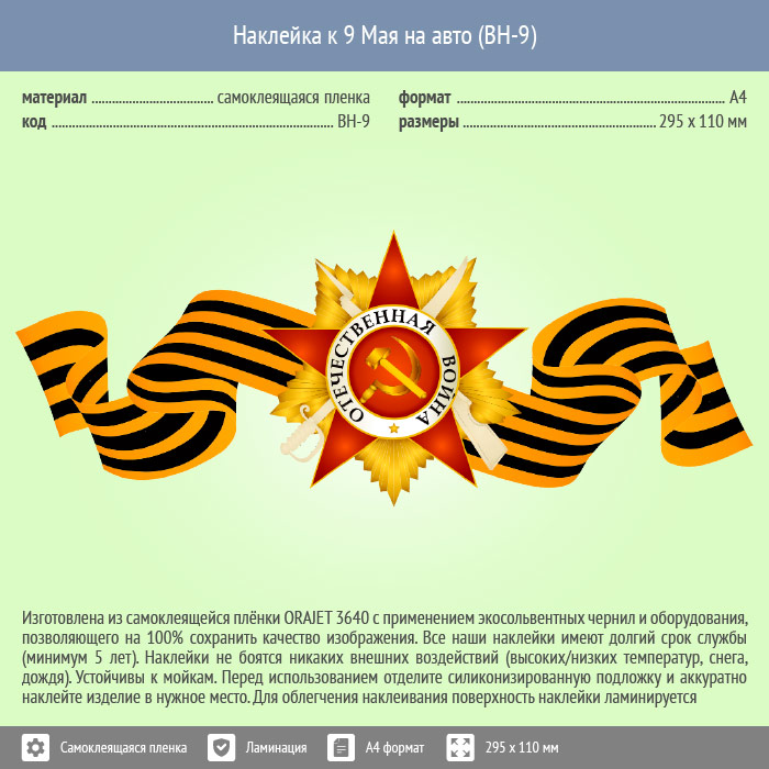 Наклейка к 9 Мая на авто А4 формата (BH-9) в Магнитогорске купить