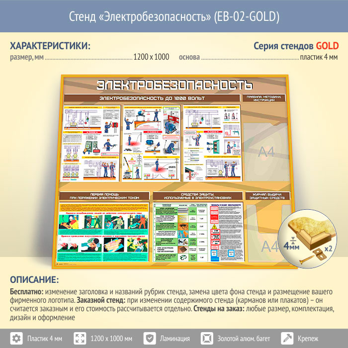 Стенд «Электробезопасность до 1000 вольт» с плоским и объемным карманами (EB-02-GOLD) в Магнитогорске купить