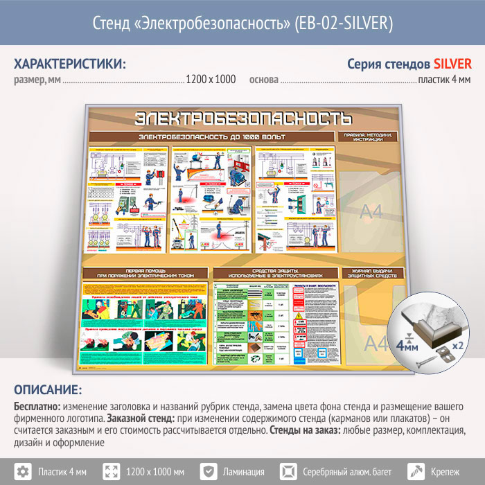 Стенд «Электробезопасность до 1000 вольт» с плоским и объемным карманами (EB-02-SILVER) в Магнитогорске купить