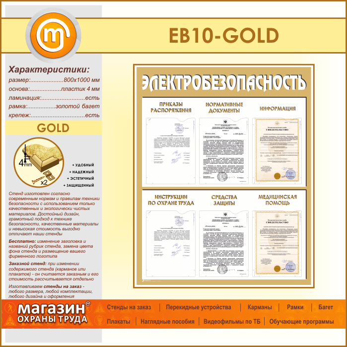 Стенд «Электробезопасность» с 6 карманами (EB-10-GOLD) в Магнитогорске купить
