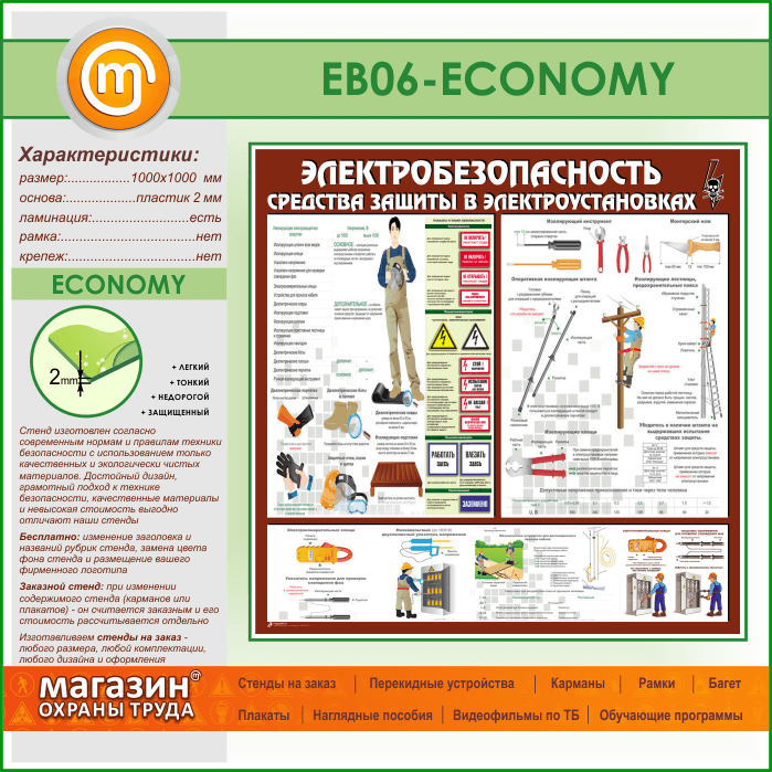 Стенд «Электробезопасность. Средства защиты в электроустановках» (EB-06-ECONOMY) в Магнитогорске купить