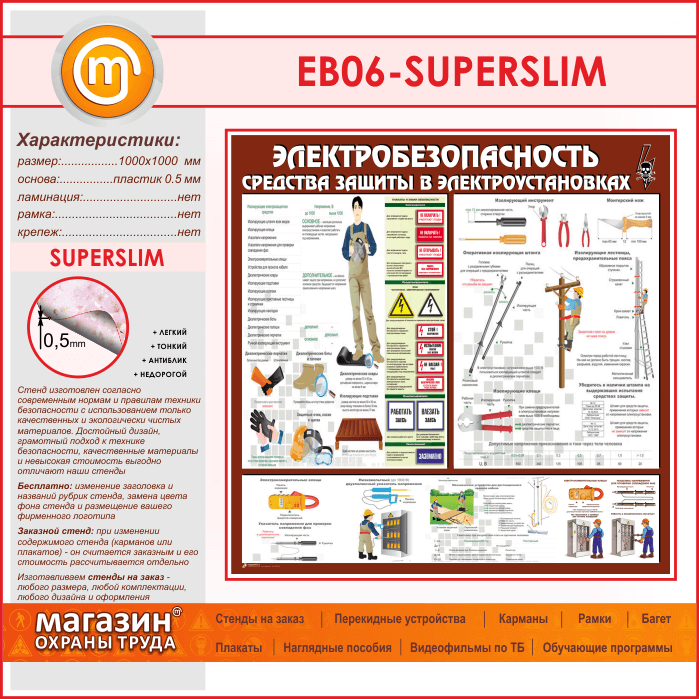 Стенд «Электробезопасность. Средства защиты в электроустановках» (EB-06-SUPERSLIM) в Магнитогорске купить