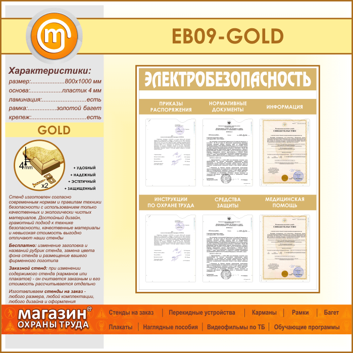 Стенд «Электробезопасность» с 6 карманами (EB-09-GOLD) в Магнитогорске купить