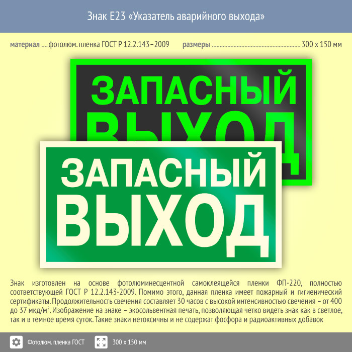 Знак E23 «Указатель запасного выхода» (устаревший) (фотолюминесцентная пленка ГОСТ 34428-2018, 300х150 мм) в Магнитогорске купить