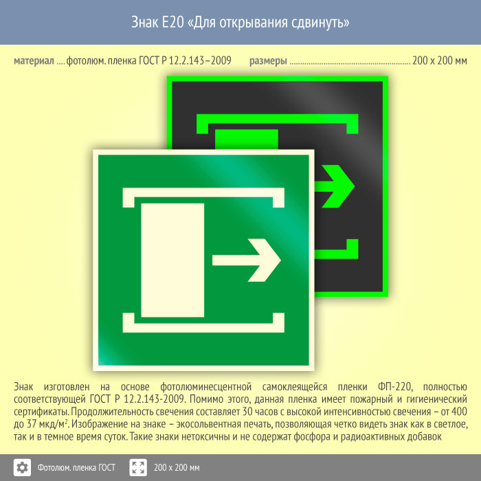 Знак E20 «Для открывания сдвинуть» (фотолюминесцентная пленка ГОСТ 34428-2018, 200х200 мм) в Магнитогорске купить