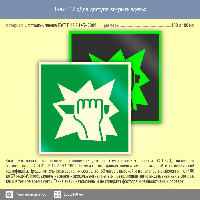 Знак E17 «Для доступа вскрыть здесь» (фотолюминесцентная пленка ГОСТ 34428-2018, 100х100 мм) в Магнитогорске купить