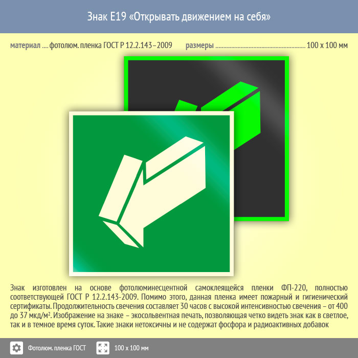 Знак E19 «Открывать движением на себя» (фотолюминесцентная пленка ГОСТ 34428-2018, 100х100 мм) в Магнитогорске купить