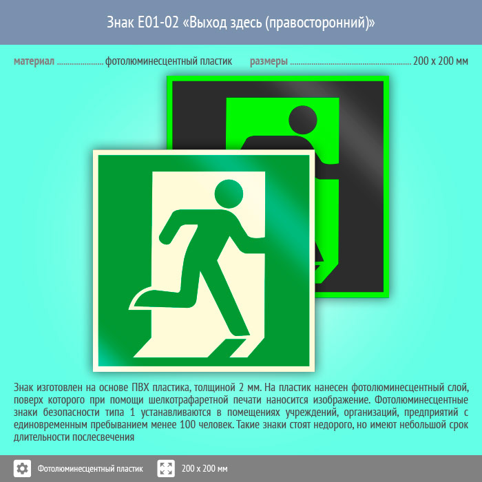 Знак E01-02 «Выход здесь (правосторонний)» (фотолюминесцентный пластик, 200х200 мм) в Магнитогорске купить