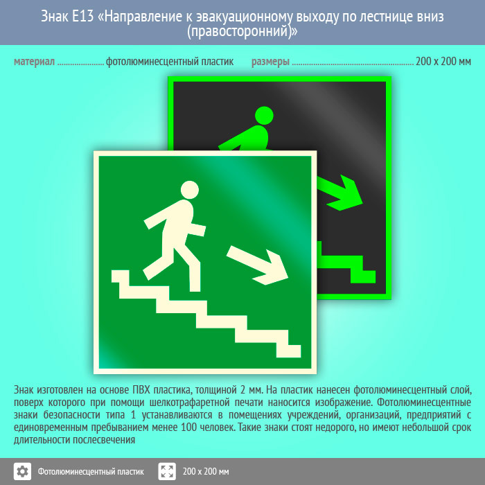 Знак E13 «Направление к эвакуационному выходу по лестнице вниз (правосторонний)» (фотолюминесцентный пластик, 200х200 мм) в Магнитогорске купить