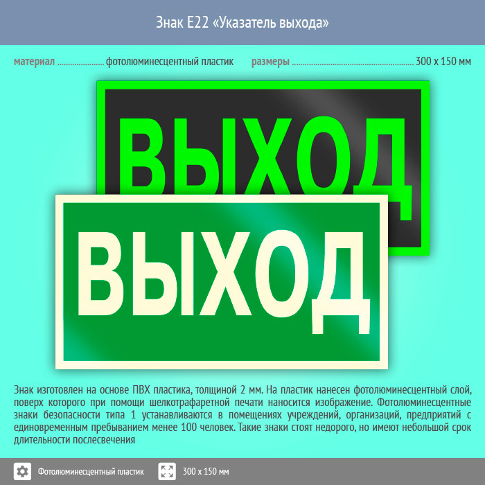 Знак E22 «Указатель выхода» (фотолюминесцентный пластик, 300х150 мм) в Магнитогорске купить