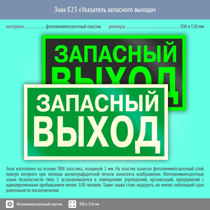 Знак E23 «Указатель запасного выхода» (устаревший) (фотолюминесцентный пластик, 300х150 мм) в Магнитогорске купить