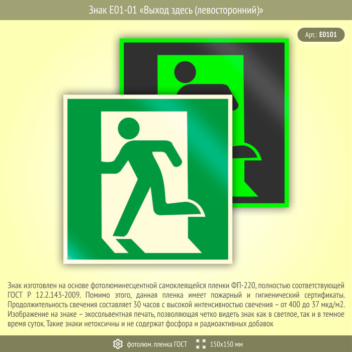 Знак E01-01 «Выход здесь (левосторонний)» (фотолюминесцентная пленка ГОСТ 34428-2018, 150х150 мм) в Магнитогорске купить
