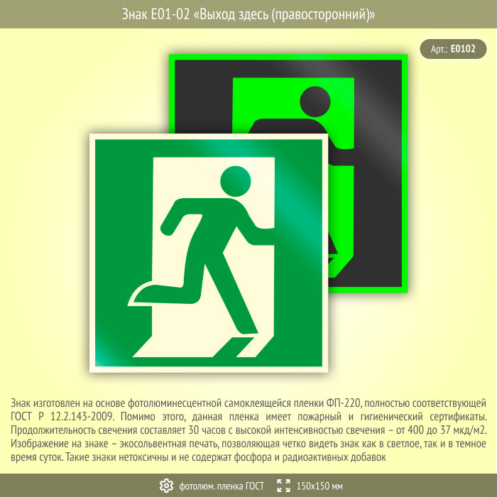 Знак E01-02 «Выход здесь (правосторонний)» (фотолюминесцентная пленка ГОСТ 34428-2018, 150х150 мм) в Магнитогорске купить