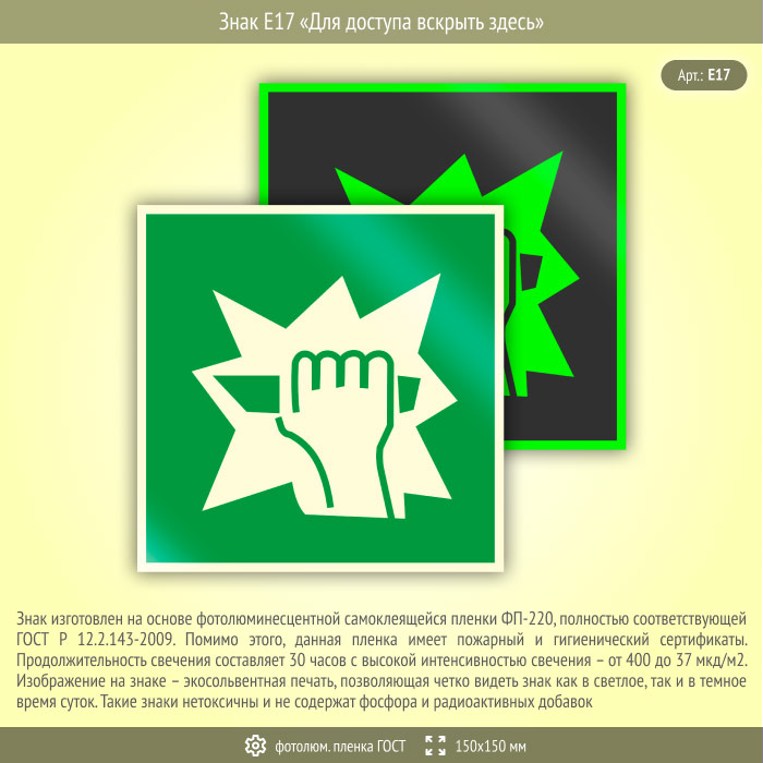 Знак E17 «Для доступа вскрыть здесь» (фотолюминесцентная пленка ГОСТ 34428-2018, 150х150 мм) в Магнитогорске купить