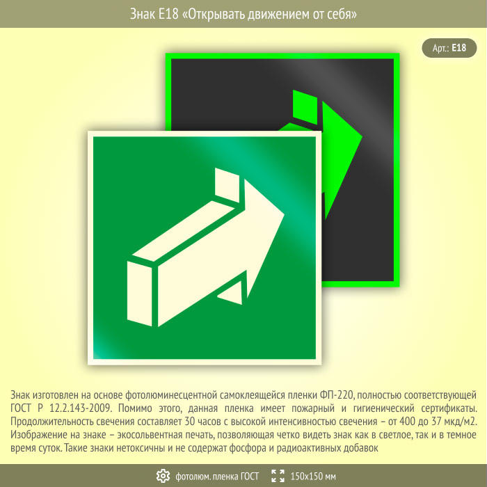 Знак E18 «Открывать движением от себя» (фотолюминесцентная пленка ГОСТ 34428-2018, 150х150 мм) в Магнитогорске купить