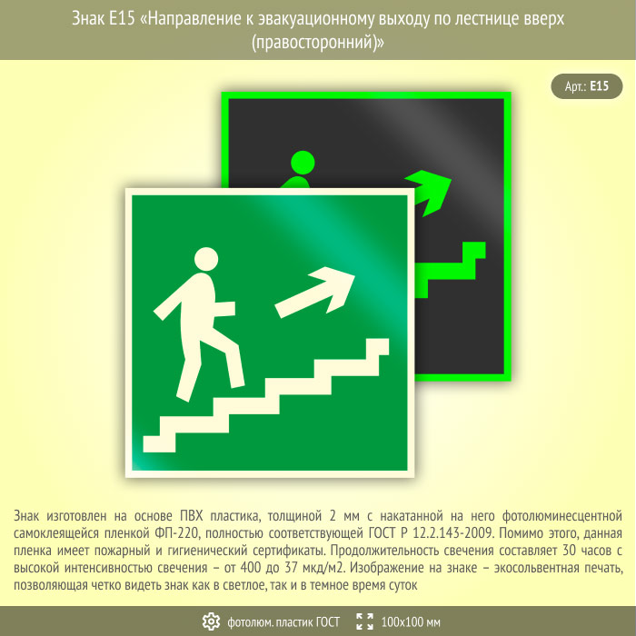 Знак E15 «Направление к эвакуационному выходу по лестнице вверх (правосторонний)» (фотолюминесцентный пластик ГОСТ 34428-2018, 100х100 мм) в Магнитогорске купить