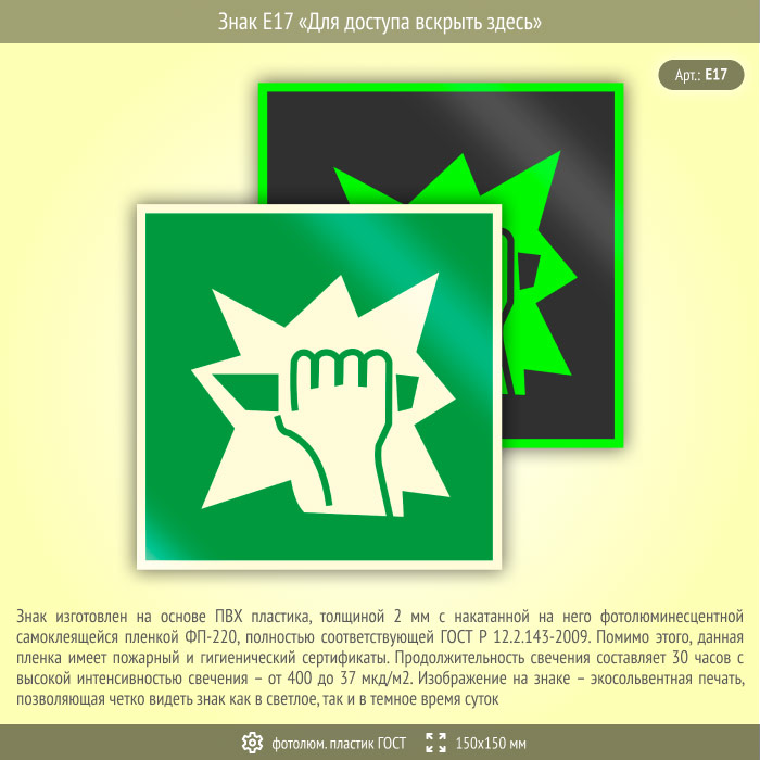 Знак E17 «Для доступа вскрыть здесь» (фотолюминесцентный пластик ГОСТ 34428-2018, 150х150 мм) в Магнитогорске купить