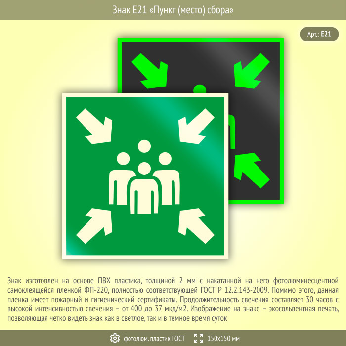 Знак E21 «Пункт (место) сбора» (фотолюминесцентный пластик ГОСТ 34428-2018, 150х150 мм) в Магнитогорске купить