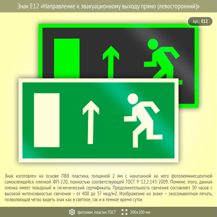 Знак E12 «Направление к эвакуационному выходу прямо (левосторонний)» (фотолюминесцентный пластик ГОСТ 34428-2018, 200х100 мм) в Магнитогорске купить