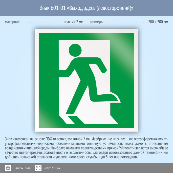 Знак E01-01 «Выход здесь (левосторонний)» (пластик, 200х200 мм) в Магнитогорске купить
