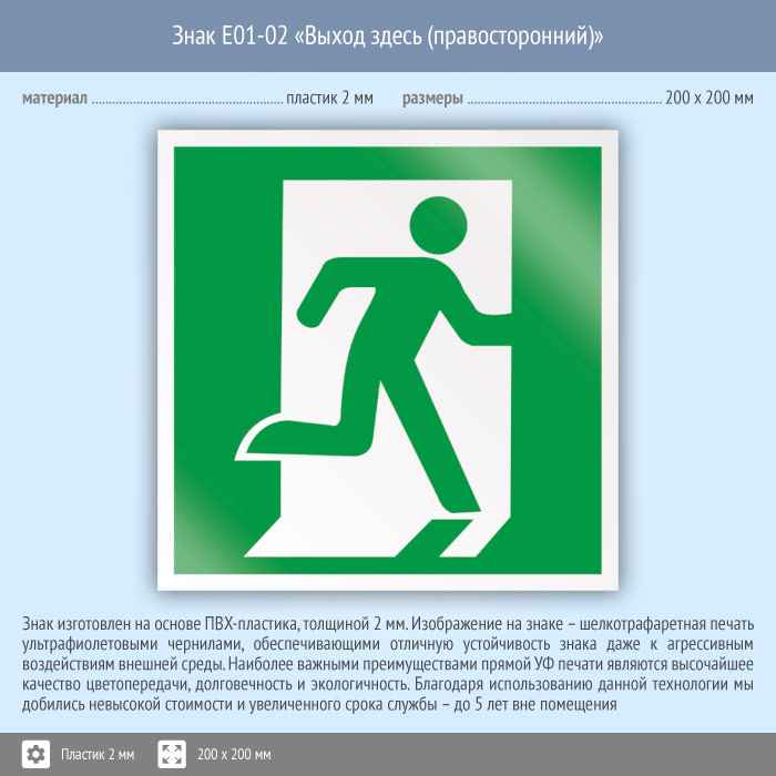 Знак E01-02 «Выход здесь (правосторонний)» (пластик, 200х200 мм) в Магнитогорске купить