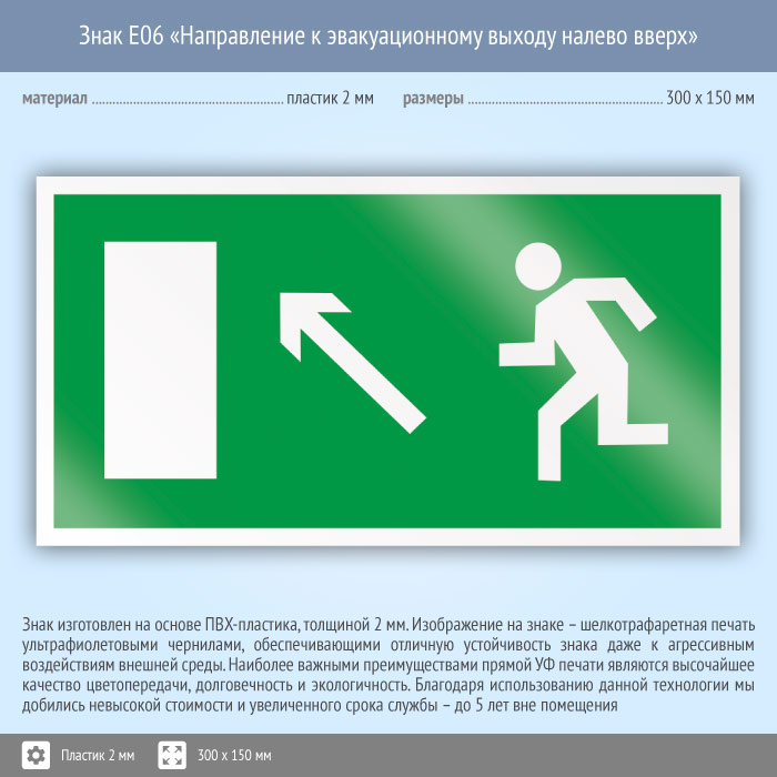 Знак E06 «Направление к эвакуационному выходу налево вверх» (пластик, 300х150 мм) в Магнитогорске купить