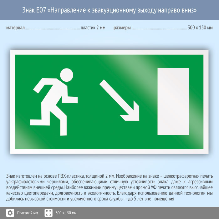 Знак E07 «Направление к эвакуационному выходу направо вниз» (пластик, 300х150 мм) в Магнитогорске купить