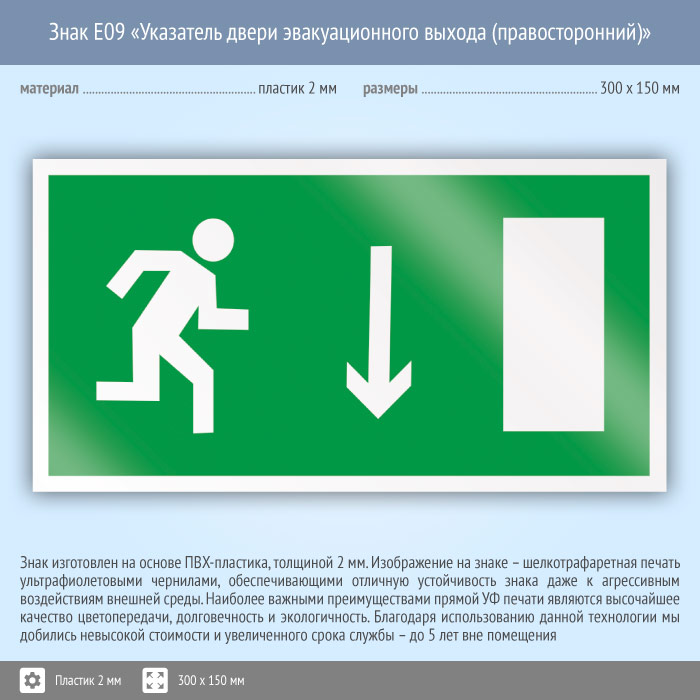 Знак E09 «Указатель двери эвакуационного выхода (правосторонний)» (пластик, 300х150 мм) в Магнитогорске купить