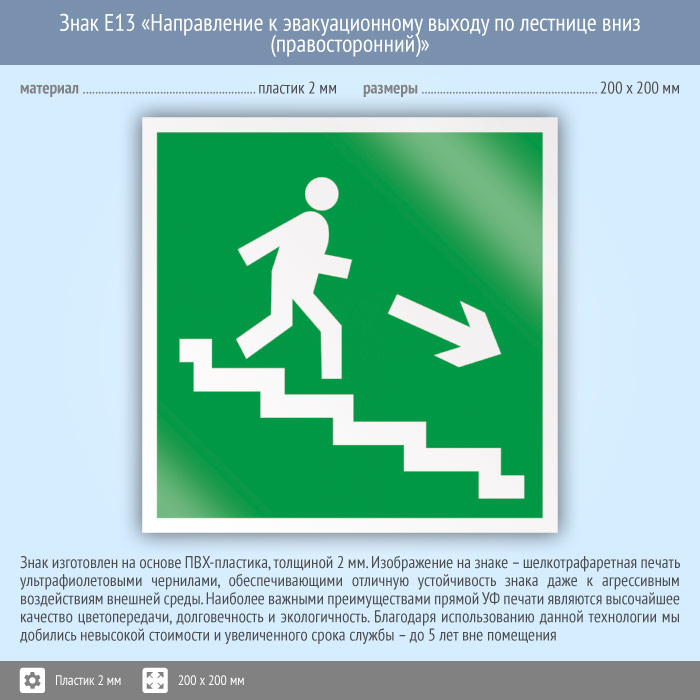 Знак E13 «Направление к эвакуационному выходу по лестнице вниз (правосторонний)» (пластик, 200х200 мм) в Магнитогорске купить