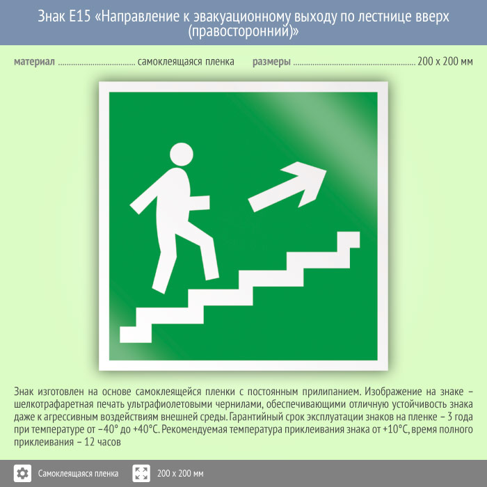 Знак E15 «Направление к эвакуационному выходу по лестнице вверх (правосторонний)» (пленка, 200х200 мм) в Магнитогорске купить