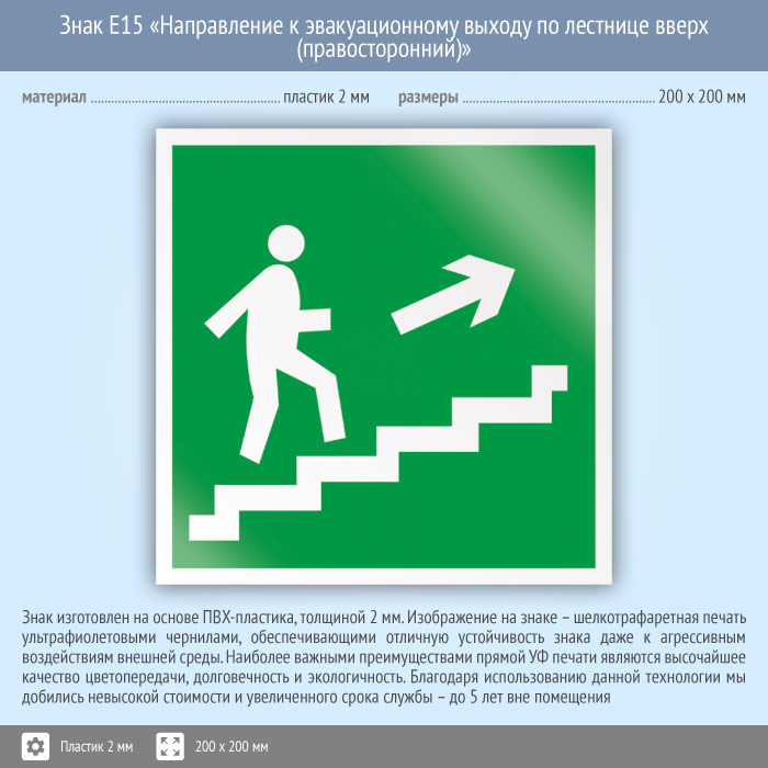 Знак E15 «Направление к эвакуационному выходу по лестнице вверх (правосторонний)» (пластик, 200х200 мм) в Магнитогорске купить